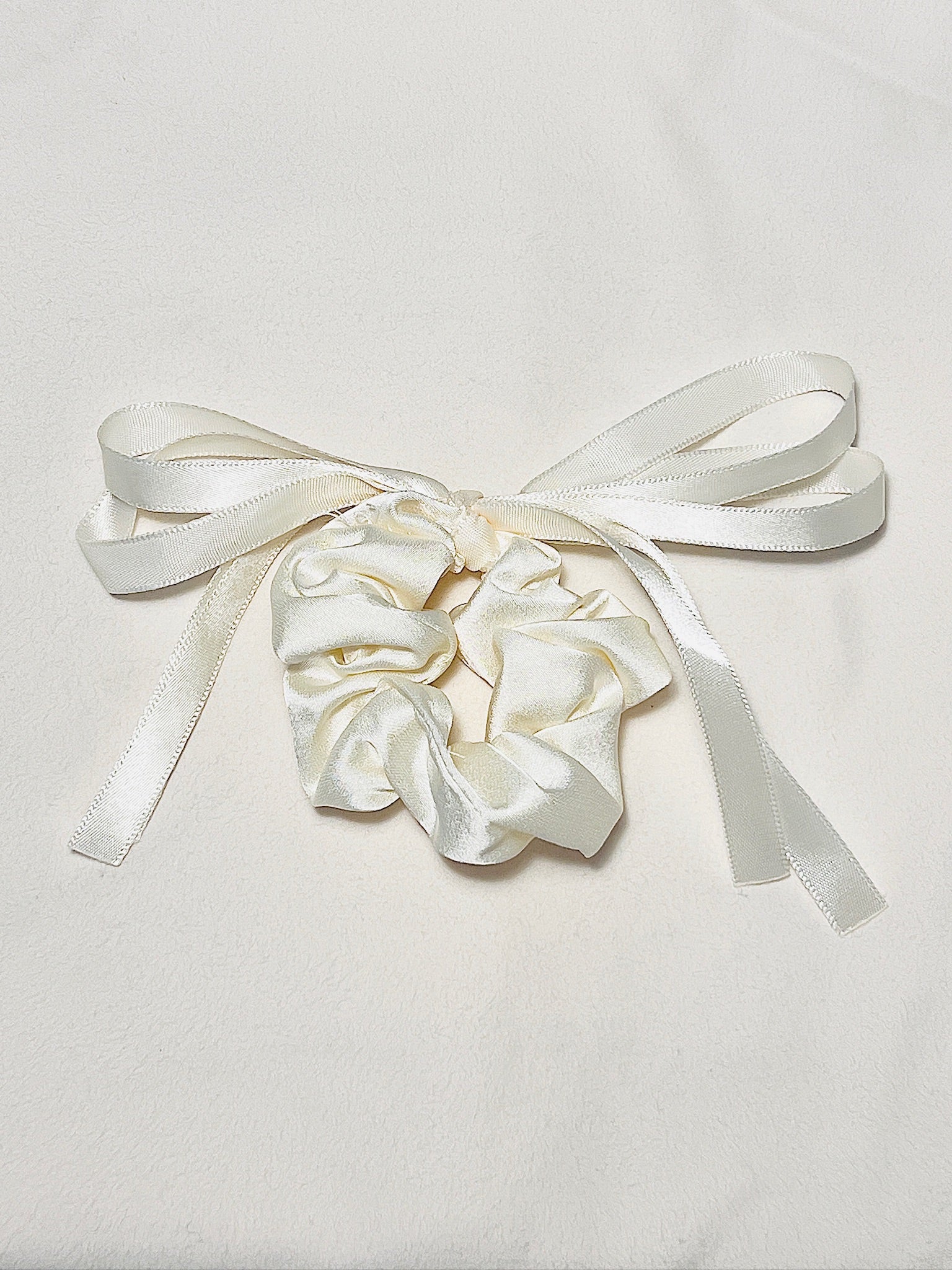 With silky ruffles and a graceful satin sheen, the Cream Pearl Scrunchie brings a touch of timeless elegance to your look. Flowing ivory ribbons tie it all together, creating a delicate, romantic finish. Perfect for special occasions or adding a soft, feminine flair to your everyday style.
