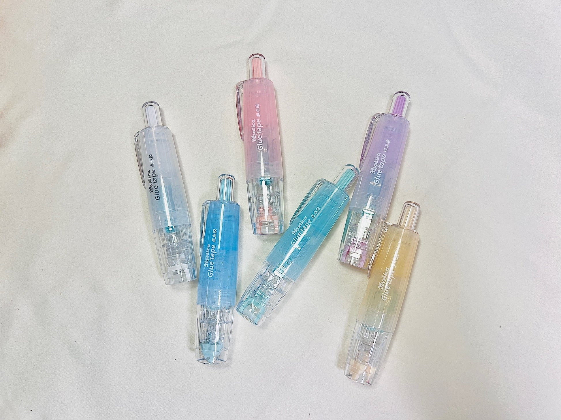 Brighten your workspace with this enchanting pastel glue tape set, featuring six soft, candy-colored dispensers in dreamy shades of blue, pink, purple, mint, white, and yellow. Each applicator delivers smooth, mess-free adhesive with a precise tip, perfect for crafting, journaling, and everyday fixes. The sleek, transparent barrel design not only looks magical but also allows you to see how much tape is left inside.