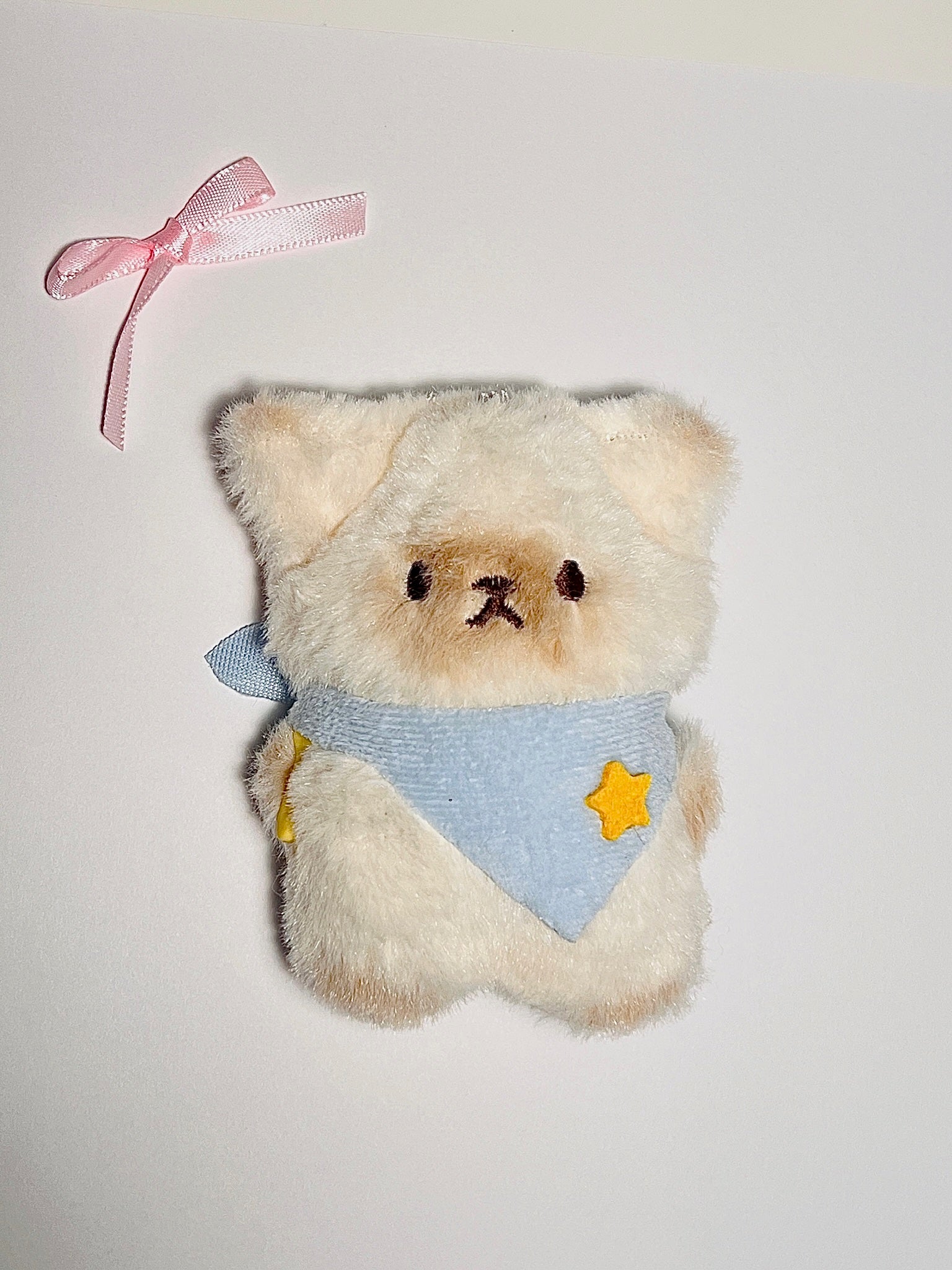 Meet your new fluffiest friend! This soft, palm-sized kitty is dressed in a pastel blue bandana with a sweet yellow star — perfect for adding a dose of cuteness to your day. Whether you're clipping it onto your bag, decorating your desk, or just collecting cuties, this plush buddy is here to keep you company.
